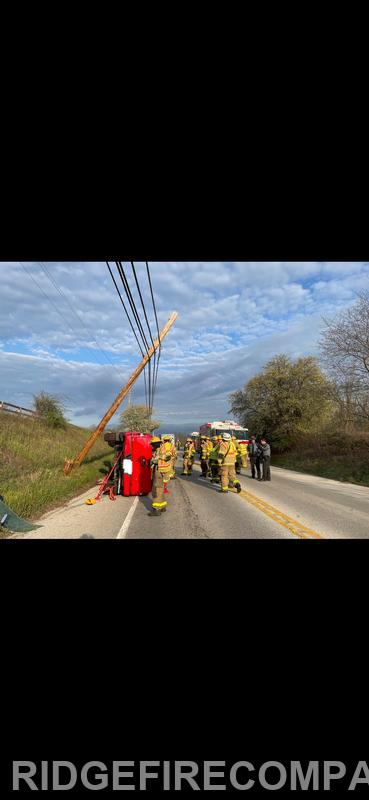 Just before 6PM Station 62 along with Ambulance 89 (Elverson-Honey Brook Area EMS) and MICU 93 (Brandywine Hospital Paramedics) were dispatched to Ridge Road (Route 23) and Old Ridge Road for an accident with entrapment. Deputy 64 arrived with Chief 62 with a pickup truck that had struck a pole and turned over onto its side with the occupant still inside.Assistant 62 established Route 23 command. Rescue 62 and Utility 62 arrived on location and immediately began to stabilize the vehicle and remove the front and rear windshield to access the occupant. Engine 62-1 arrived and assisted with patient removal. Fire police units had route 23 shut down to allow crews to operate safely. The occupant was quickly removed and transported to a local hospital for treatment.